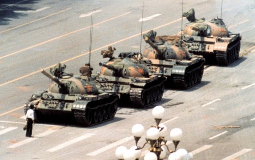 S taškou proti granátům. Fotografie pána, který se postavil do cesty tankům, se stala symbolem povstání na náměstí Nebeského klidu. (Zdroj:https://www.lowbird.com/)